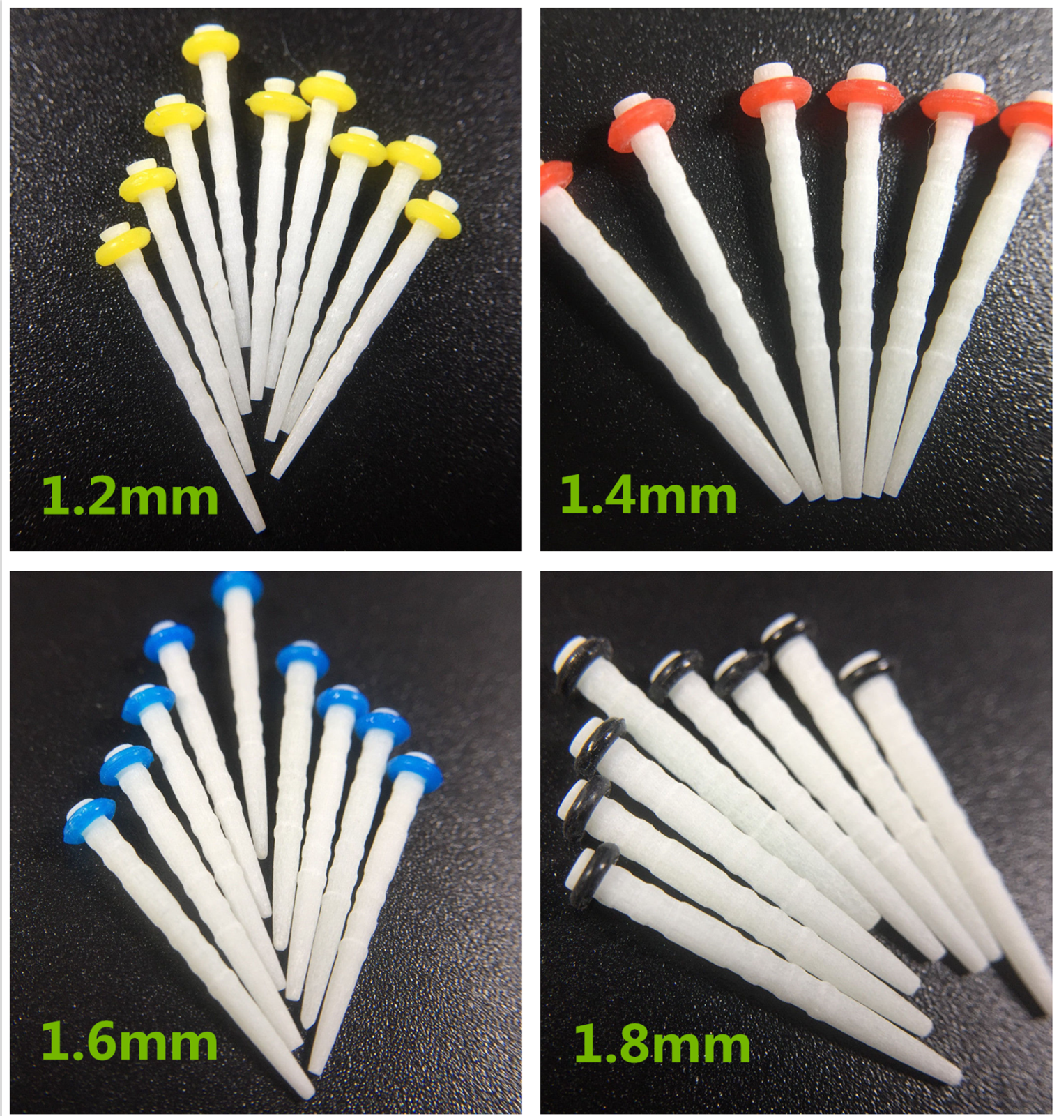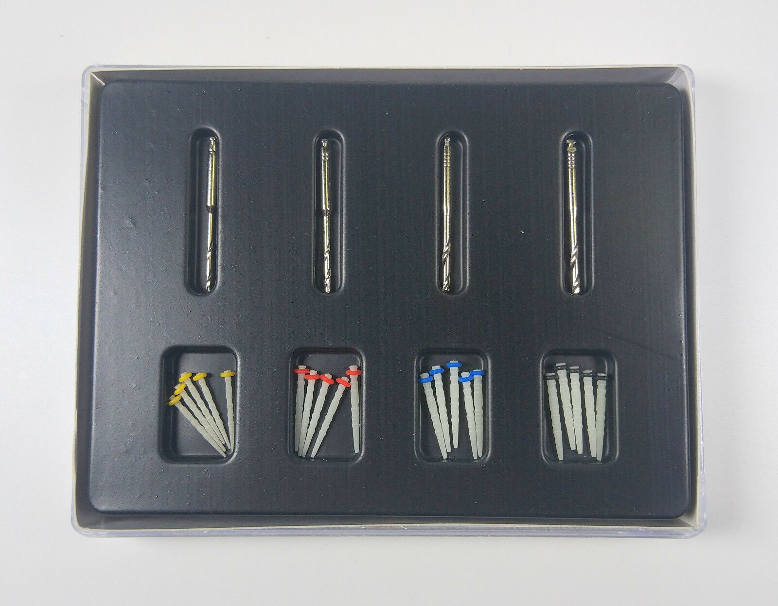 - У наборі є скловолоконні штифти 4 розмірів. Кожному розміру штифтів відповідає калібрувальний дриль, що входить в комплект.